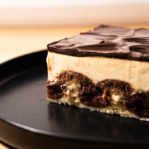 A nostalgic sheet cake with light and cocoa batters, baked with cherries into soft “waves” and finished with vanilla custard cream and chocolate glaze – all the classic flavours, now fully vegan.