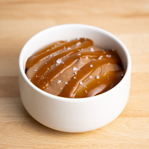 Airy chocolate mousse topped with glossy salted caramel and a sprinkle of flaky salt – simple ingredients, making it ideal for dinner parties when you want something rich, creamy and chocolatey without a lot of last-minute stress.